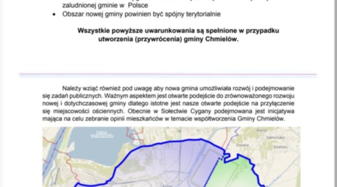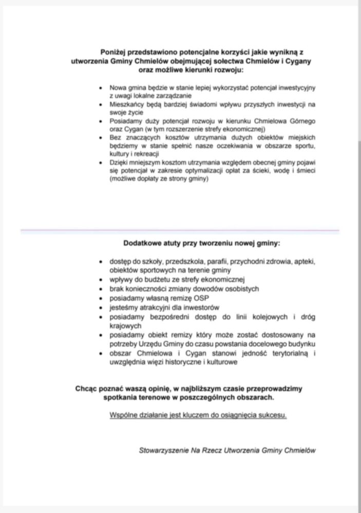 Uzgodniono również że w tej kwestii muszą wyrazić opinię wszyscy mieszkańcy naszej miejscowości. W tym celu zostanie rozprowadzona broszura informacyjna, po czym każdy dorosły mieszkaniec będzie mógł wyrazić swoje stanowisko składając podpis popierający powstanie nowej Gminy.