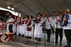 W części obrzędowej, jak nakazuje tradycja, każde sołectwo zaprezentowało swój dożynkowy wieniec, który był ośpiewany przez delegacje ludowe z poszczególnych wsi. Reprezentanci każdej wioski przekazywali bochny chleba dożynkowym gospodarzom i gościom. Ważnym punktem uroczystości było rozstrzygnięcie konkursów na najpiękniejszy wieniec dożynkowy i najsmaczniejszy jabłecznik sołtysa. Na czele komisji konkursowej stanęła p. Bożena Staszczak – kustosz Muzeum Historycznego Miasta Tarnobrzega. Wyniki ogłosił dyrektor SOK p. Krystian Rzemień oraz radny powiatowy p. Jerzy Sudoł – pasjonat lokalnej historii. Główną nagrodę Burmistrza Miasta i Gminy za wieniec dożynkowy uzyskało sołectwo Rozalin, pozostałe sołectwa otrzymały nagrody pocieszenia, gdyż wszystkie wieńce były piękne i wymagały wielu godzin pracy. Najsmaczniejszy oryginalny jabłecznik przygotowały gospodynie z Chmielowa. Wszyscy sołtysi otrzymali podziękowania i nagrody ufundowane przez Burmistrza i Dyrektora SOK. Kolejnym punktem imprezy było losowanie wsi, która zostanie gospodarzem przyszłorocznych Dożynek. Kazimierz Durda wręczył okazałą wiechę sołtysowi z Chmielowa – ta wieś będzie organizowała imprezę za rok.