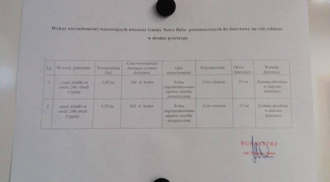 Ogłoszenie o przetargu na dzierżawę działek na których uprawiana jest wierzba energetyczna.