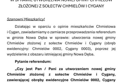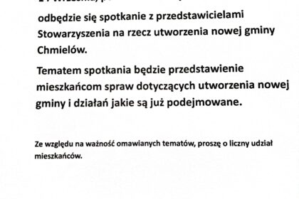W najbliższą niedzielę po zebraniu wiejskim, o godzinie 13.00 w CKL w Cyganach, odbędzie się spotkanie informacyjne związane z utworzeniem gminy Chmielów. Podczas spotkania omówione zostaną powody i c...