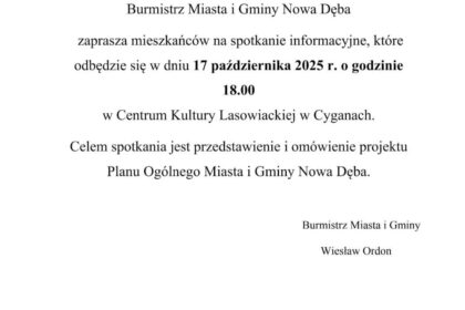 W piątek 17 październik o godz. 18.00 w Centrum Kultury Lasowiackiej odbędzie się spotkanie informacyjne poświęcone przedstawieniu i omówieniu przyszłego Planu Ogólnego dla MiG Nowa Dęba. Zachęcamy do...