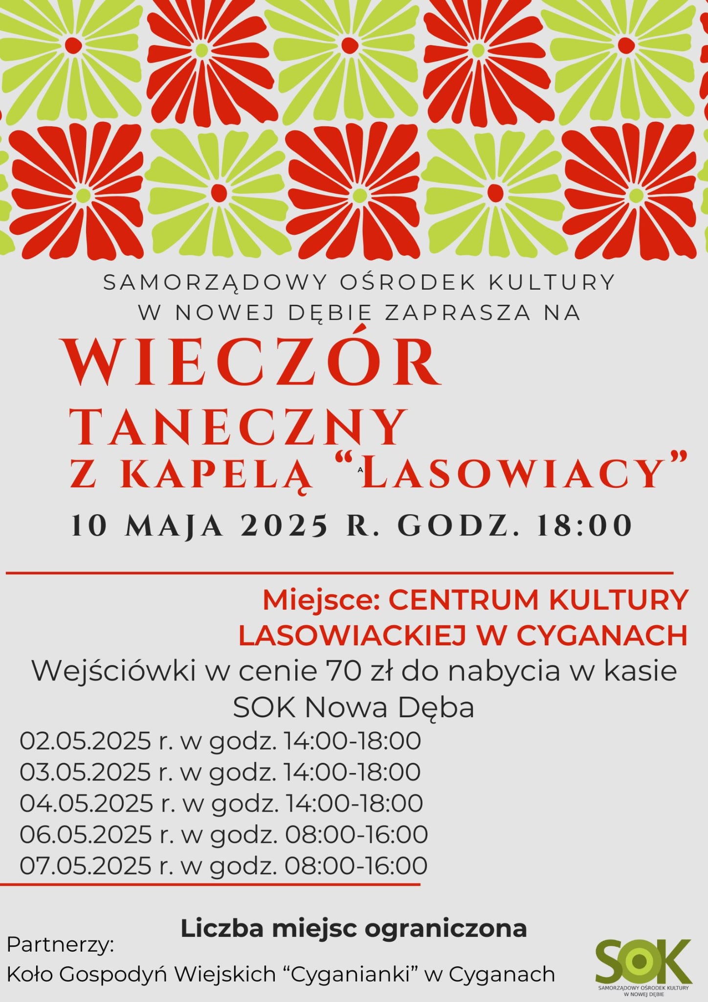 Centrum Kultury Lasowiackiej w Cyganach zaprasza na zabawę taneczną z Kapelą „Lasowiacy”. Szczegóły na plakacie....