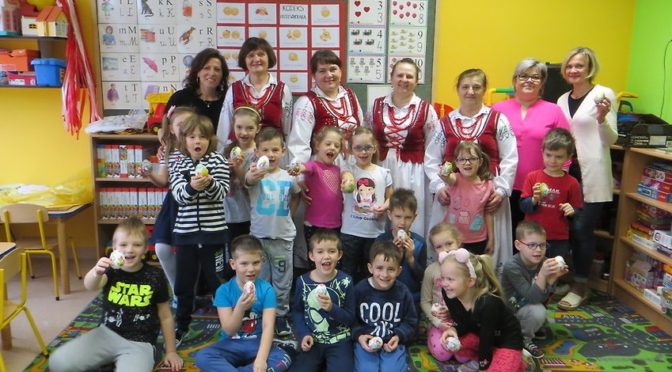 Czas przedświąteczny to okazja do prezentowania rękodzieła artystycznego w szkołach i przedszkolach. Tym razem 15 marca, panie z zespołu Cyganianki gościły w Przedszkolu Integracyjnym Nr 9 w Tarnobrzegu, gdzie opowiadały o dawnych zwyczajach wielkopostnych i świątecznych, oraz razem z dziećmi wykonywały pisanki.