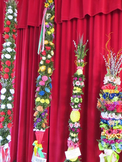Pani Teresa Zych jest mieszkanką wsi Cygany w Gminie Nowa Dęba. Od kilku lat zajmuje się rękodziełem. Na różne doroczne święta, przygotowuje rozmaite przedmioty dekoracyjne. Najwięcej tworzy przed Świętami Bożego Narodzenia i przed Wielkanocą. Swoimi wytworami obdarowuje najbliższych i znajomych. Domownicy cieszą się, że nie muszą wymyślać dekoracji, bo mają ich zawsze pod dostatkiem. Jak mówi, zajęcie to daje jej wiele radości i satysfakcji. Panią Zych odwiedziłam tuż przed Niedzielą Palmową, dlatego mogłam zachwycać się przede wszystkim palmami osobliwej urody. Nie zabrakło też jajek ozdobionych współczesnymi technikami, koszyczków robionych na szydełku i koszyków wykonanych z witek wierzby. Te ostatnie, jak się dowiedziałam robi mąż pani Teresy, Franciszek Zych. Wykonuje je z wierzby, bo w pobliżu nie ma nigdzie wikliny. Pani Teresa każdy koszyczek pięknie ozdabia szytymi przez siebie serwetkami. Jeden z nich przyozdobiony jest kłosami, jak mi wyjaśniła, przyozdobiła go tak na dożynki. Pokazała mi też jeden z wianuszków, jakie przygotowała latem dla dziewcząt asystujących przy wieńcu dożynkowym. Zarówno wspomniane wianki, jak i palmy, uwite są z naturalnych materiałów, bo jak mówi artystka, natura jest tak piękna, że szkoda ją szpecić sztucznymi dodatkami. Swoje kompozycje umiejętnie różnicuje jedynie formą i odcieniami zasuszonych roślin. Wykorzystuje do nich przede wszystkim różnego rodzaju trawy zbierane z pobliskich łąk, zboża i len, który sama specjalnie w tym celu wysiewa. Podstawowym składnikiem palm jest trzcina, tradycyjnie używa też bukszpanu i gałązek z wierzby. Pani Teresa materiały na palmy gromadzi prawie przez cały rok, bo każda roślina musi być zebrana w odpowiednim czasie i zasuszona we właściwych warunkach, po to, by zachowała pożądaną barwę i formę. Palmy przyozdabia kwiatkami z kolorowej krepiny, które również sama wykonuje. Każda z nich jest inna, ale charakterystyczna dla twórczości tej artystki, po prostu dobrze skomponowana, estetyczna i piękna.