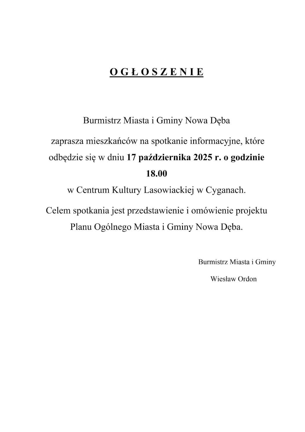 W piątek 17 październik o godz. 18.00 w Centrum Kultury Lasowiackiej odbędzie się spotkanie informacyjne poświęcone przedstawieniu i omówieniu przyszłego Planu Ogólnego dla MiG Nowa Dęba. Zachęcamy do wzięcia udziału w spotkaniu.