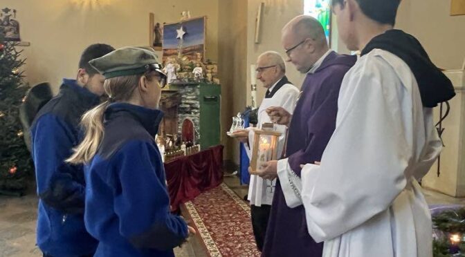 Harcerze z 2 szczepu „Szkwał” w Tarnowskiej Woli podczas mszy w kościele parafialnym w Cyganach przekazali Betlejemskie Światło Pokoju.
