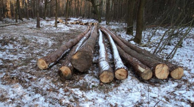 Dobiega końca wycinka w lesie gminnym drzew które zostały połamane lub przewrócone podczas wiatrów. W przyszłym tygodniu odbędzie się odbiór i wycena drzewa, będzie ono dostępne do zakupu.