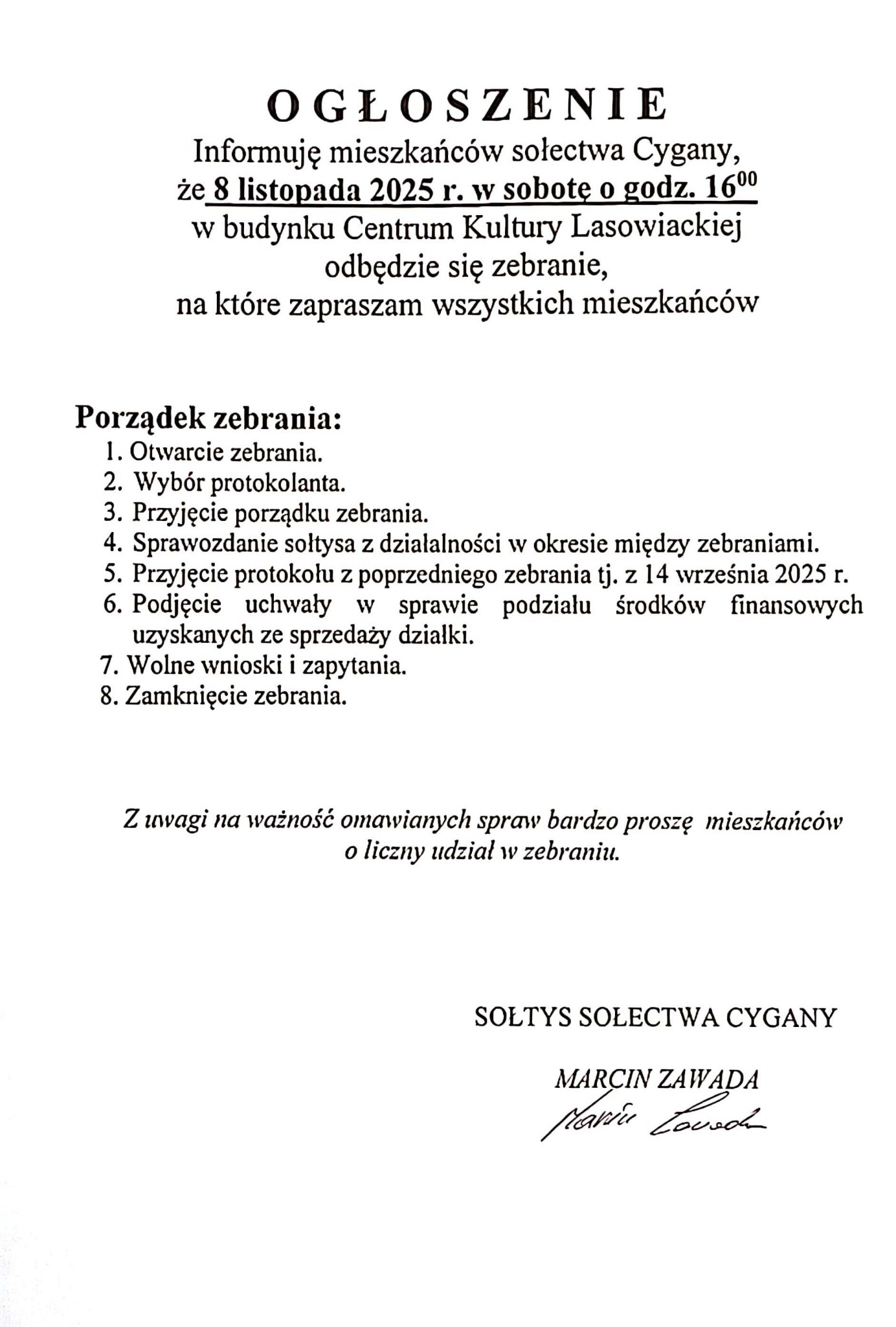 8 listopada o godz. 16.00 w CKL w Cyganach odbędzie się zebranie wiejskie.